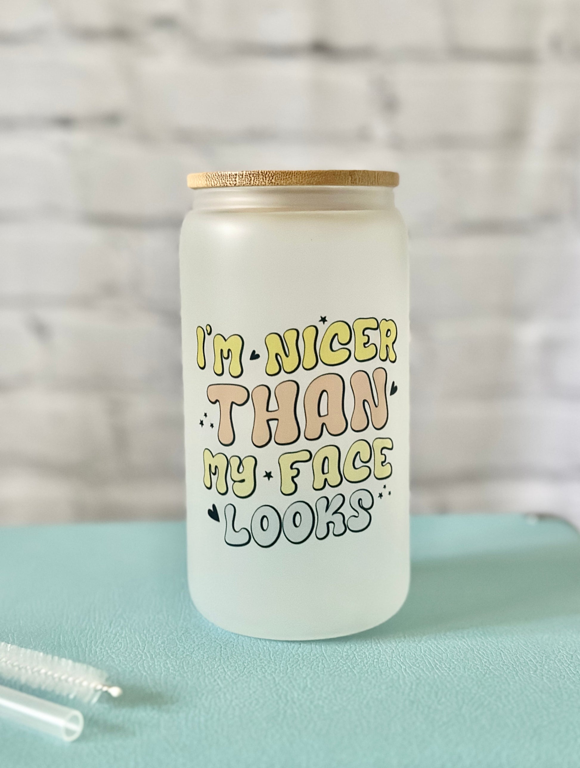 Let this glass with a bamboo lid speak for you with its witty message "I’m Nicer Than My Face Looks". Perfect for adding humor to your drinkware collection.