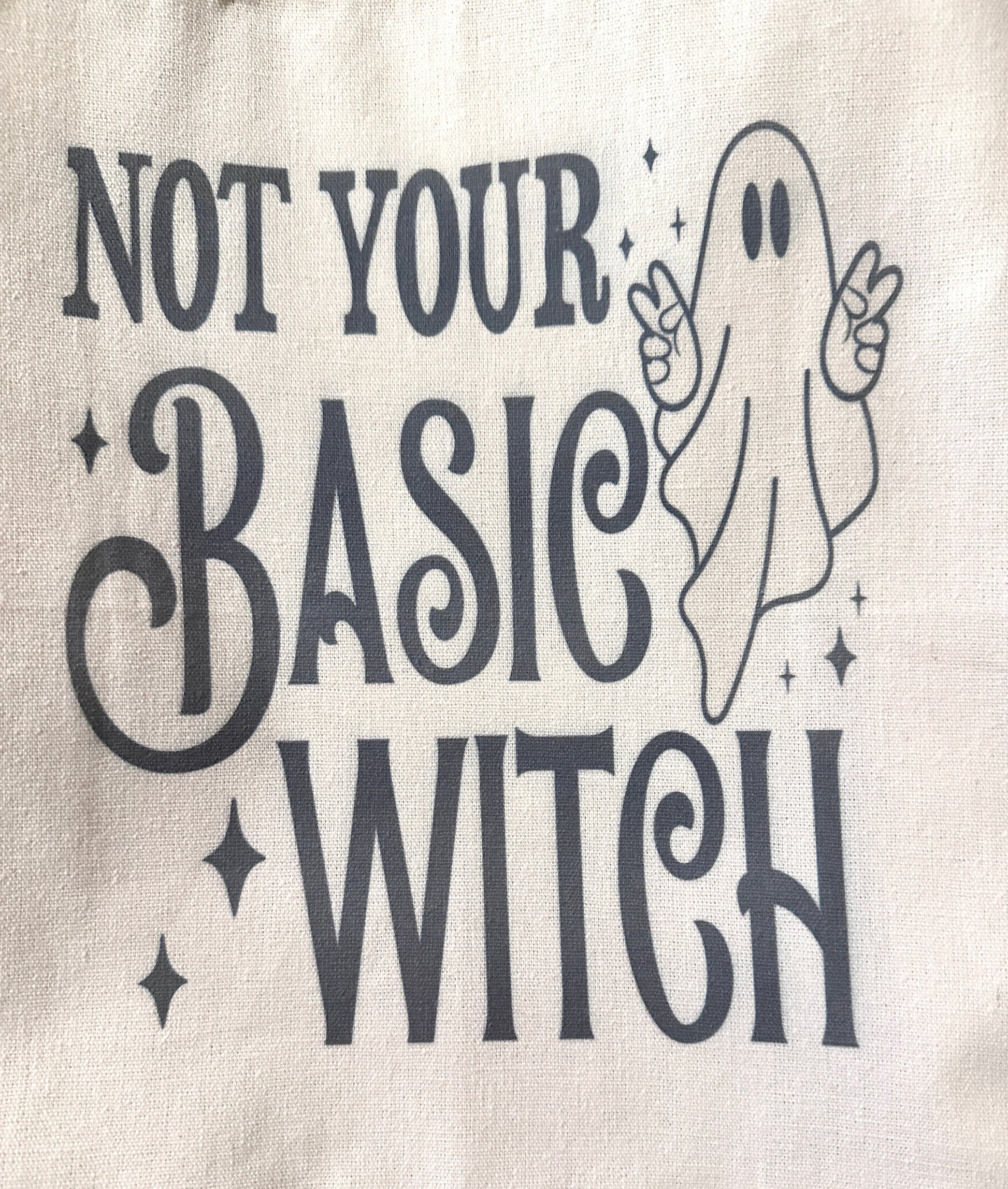 Upgrade your tote game with this Not Your Basic Witch tote bag. Perfect for fall, this fun and playful bag features a ghost design, making it a must-have for any witchy fashionista. Spot clean recommended for lasting style.